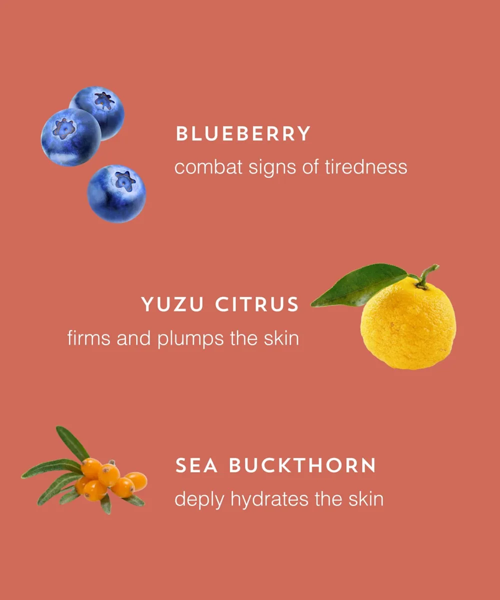 Vaccinium Angustifolium (Blueberry) Fruit Extract, Glycerin, Pentylene Glycol, Citrus Limon (Lemon) Fruit Extract, Hippophae Rhamnoides Fruit Extract, Citrus Limon (Lemon) Fruit Oil, Hibiscus Esculentus Fruit Extract, Dioscorea Opposita Root Extract, Linum Usitatissimum Seed Extract, Salvia Hispanica Seed Extract, Hedera Helix (Ivy) Leaf Extract, Decyl glucoside, Limonene, Citral