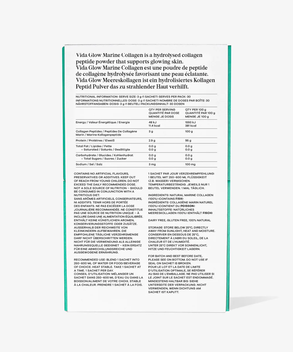 استعدي بشرتك من الداخل وأعيدي لها حيويتها من خلال استخدام كيسات الكولاجين البحري الطبيعي من فيدا غلو الأصلية. تم تصميم هذه المكملات الغذائية بببتيدات الكولاجين لدعم عملية الشيخوخة الطبيعية، وهي مصنوعة من جلد الأسماك ومُنشطة لتعزيز الامتصاص وتحفيز إنتاج الكولاجين. تمت إثبات فعالية هذه الكيسات سريرياً في تقليل الخطوط الدقيقة والتجاعيد، وتعزيز مرونة البشرة، وتحفيز نمو الشعر والحفاظ على صحته، وتعزيز نمو وقوة الأظافر. بتركيبة بدون نكهة، يمكن بسهولة إضافة هذه الكيسات إلى روتينك اليومي عن طريق خلطها مع أي طعام أو مشروب.