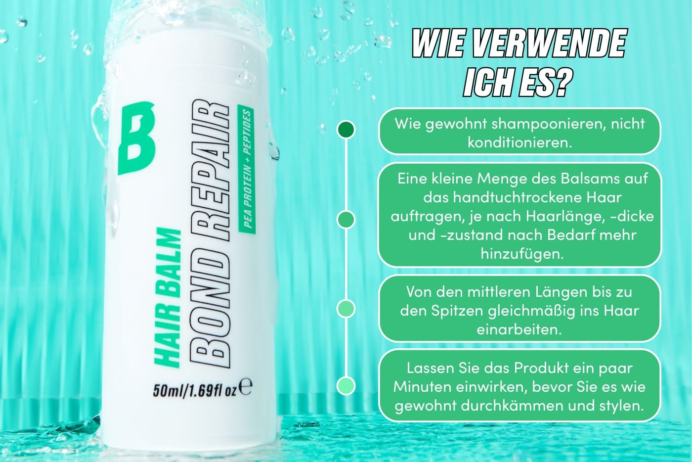 - Eine kleine Menge des Balsams auf das handtuchtrockene Haar auftragen, je nach Haarlänge, -dicke und -zustand nach Bedarf mehr hinzufügen.