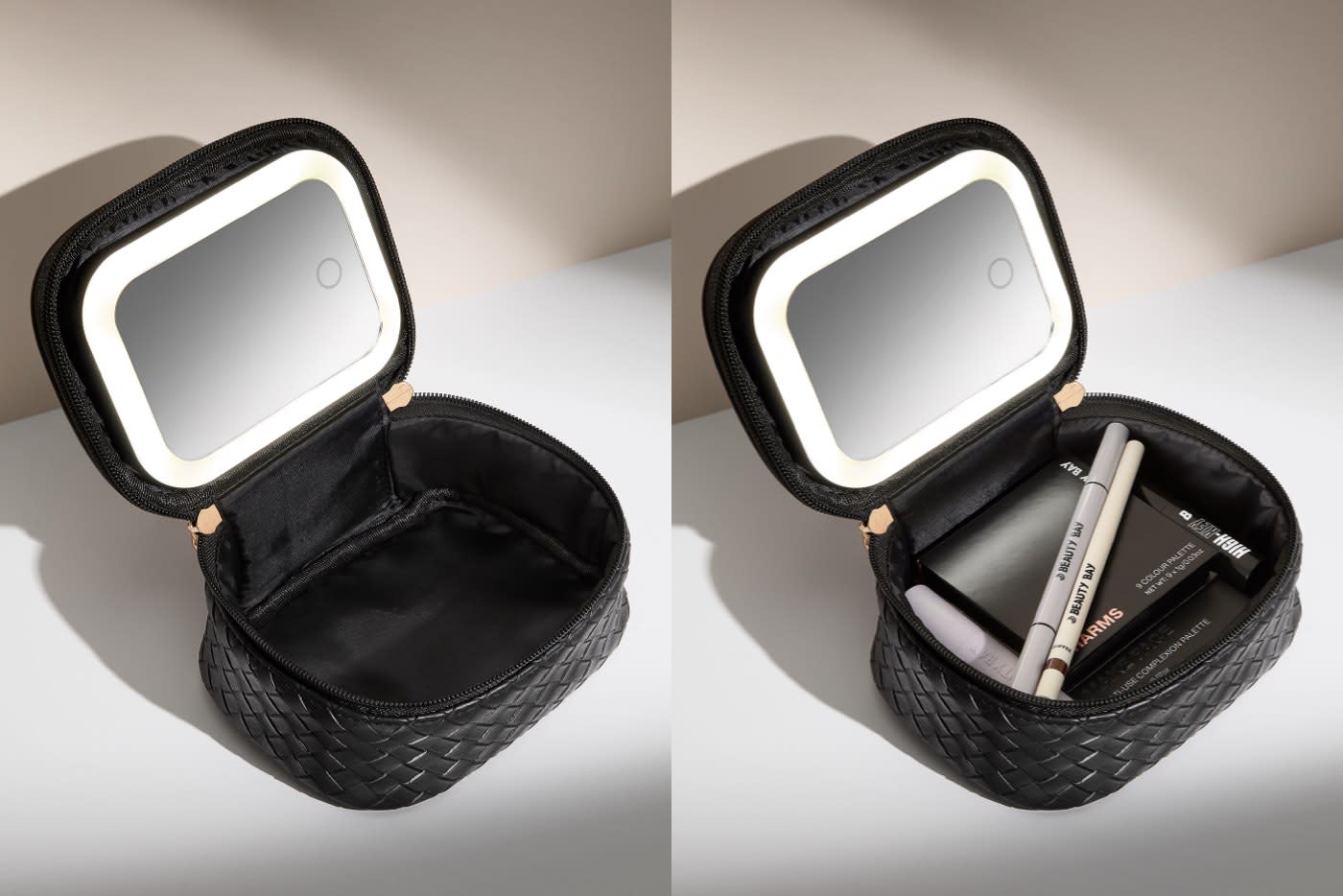 Store your beauty essentials safely and in style with the LED Mirror Mini Travel Beauty Bag from By BEAUTY BAY. Inside, you’ll find a detachable, rechargeable LED mirror, making it easy to apply or touch up your makeup wherever your plans take you. Made from black woven PU with gold hardware, this structured case keeps your must-have products secure and organised. With custom ‘B’-shaped zip pulls and a gold embossed ‘B’ logo detailing, it combines functionality with a sleek, ultra-convenient design.