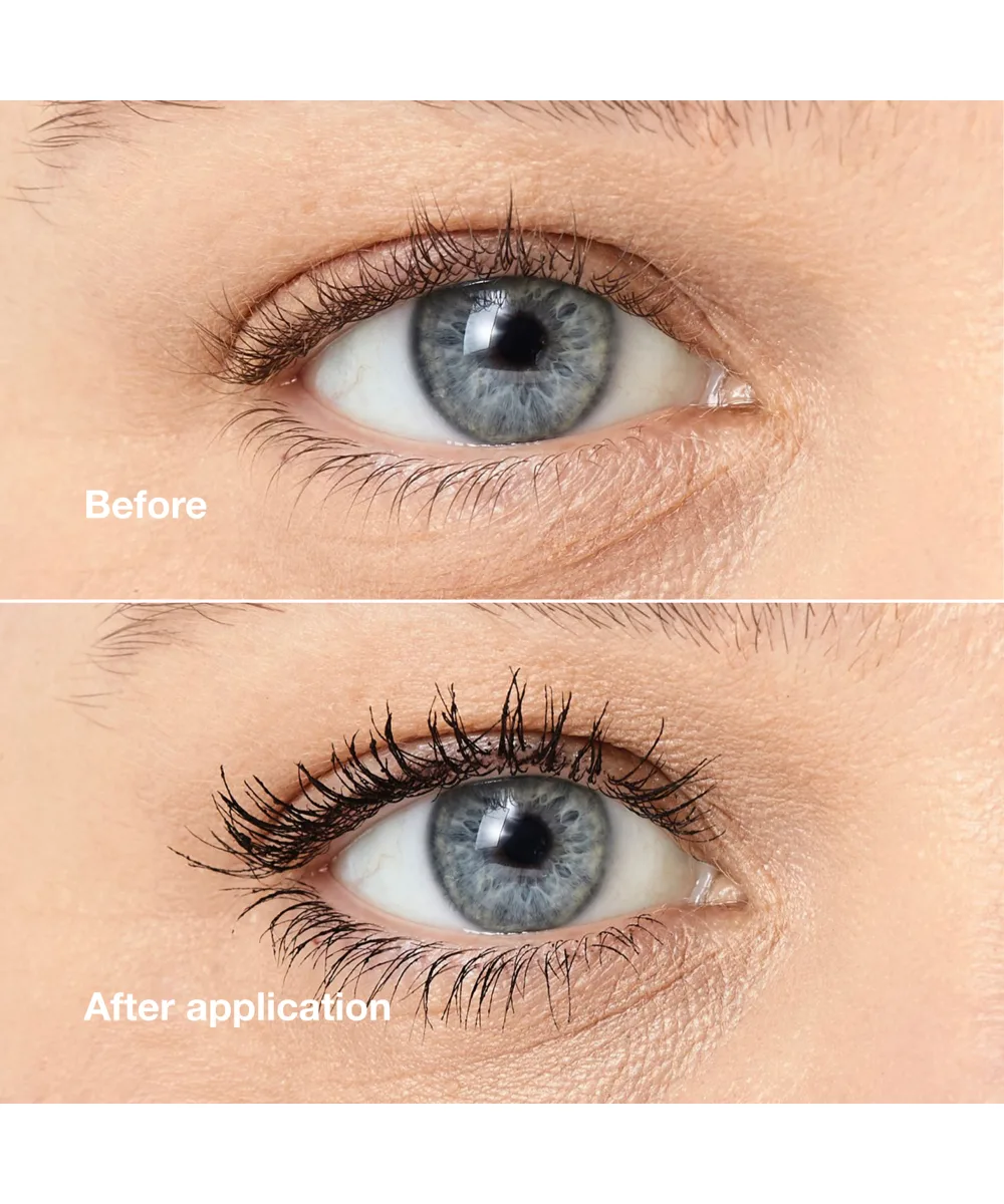 - Starting at your lash roots, sweep the brush upward to see instant volume.