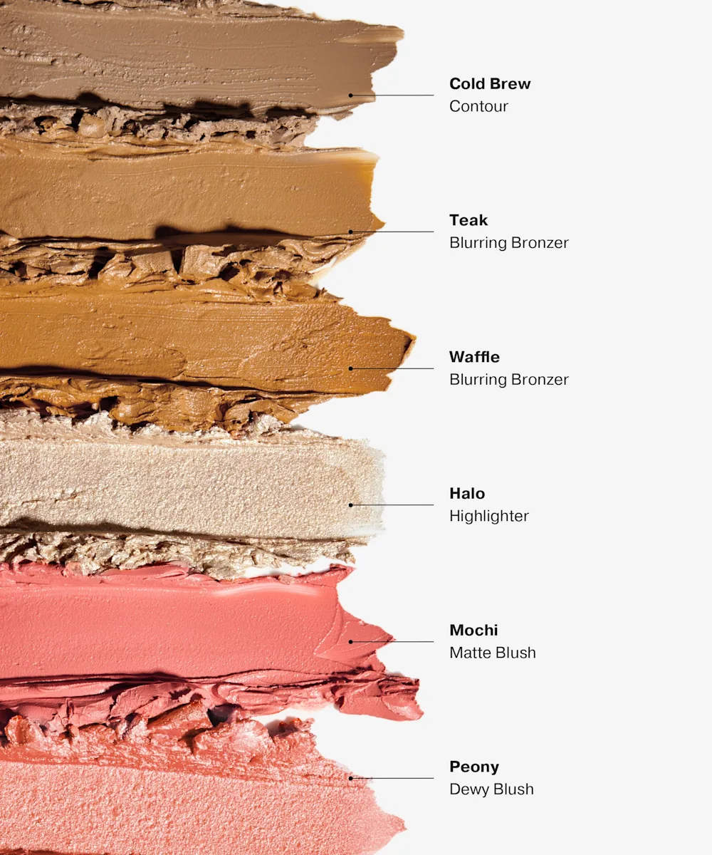 Mochi, Waffle, Teak: Caprylic/Capric Triglyceride, Ethylhexyl Palmitate, Mica, Microcrystalline Wax, Silica, Polyethylene, Paraffin, Phenoxyethanol, Tocopheryl Acetate, Polyhydroxystearic Acid, Camellia Japonica (Camellia) Seed Oil, Limnanthes Alba (Meadowfoam) Seed Oil. May Contain (+/-): Titanium Dioxide (CI 77891), Iron Oxides (CI 77491, Ci 77492, CI 77499), Yellow 6 Lake (CI 15985), Red 6 Lake (CI 15850).