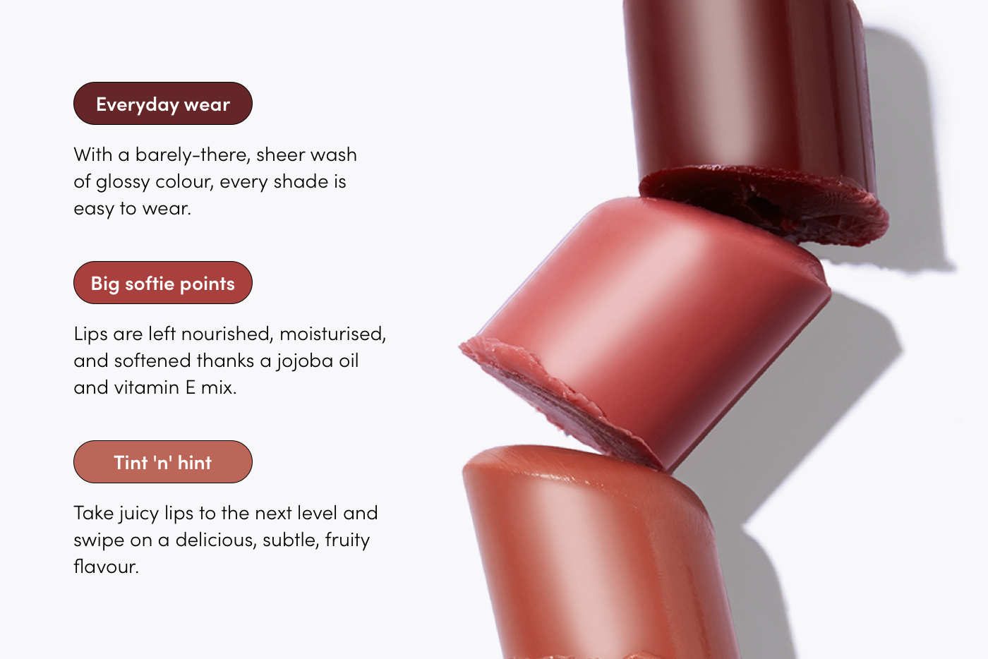Time to put life back in your lips. Get soft, smooth, supple lips, and subtle shine and colour, with our trio of tinted balms.