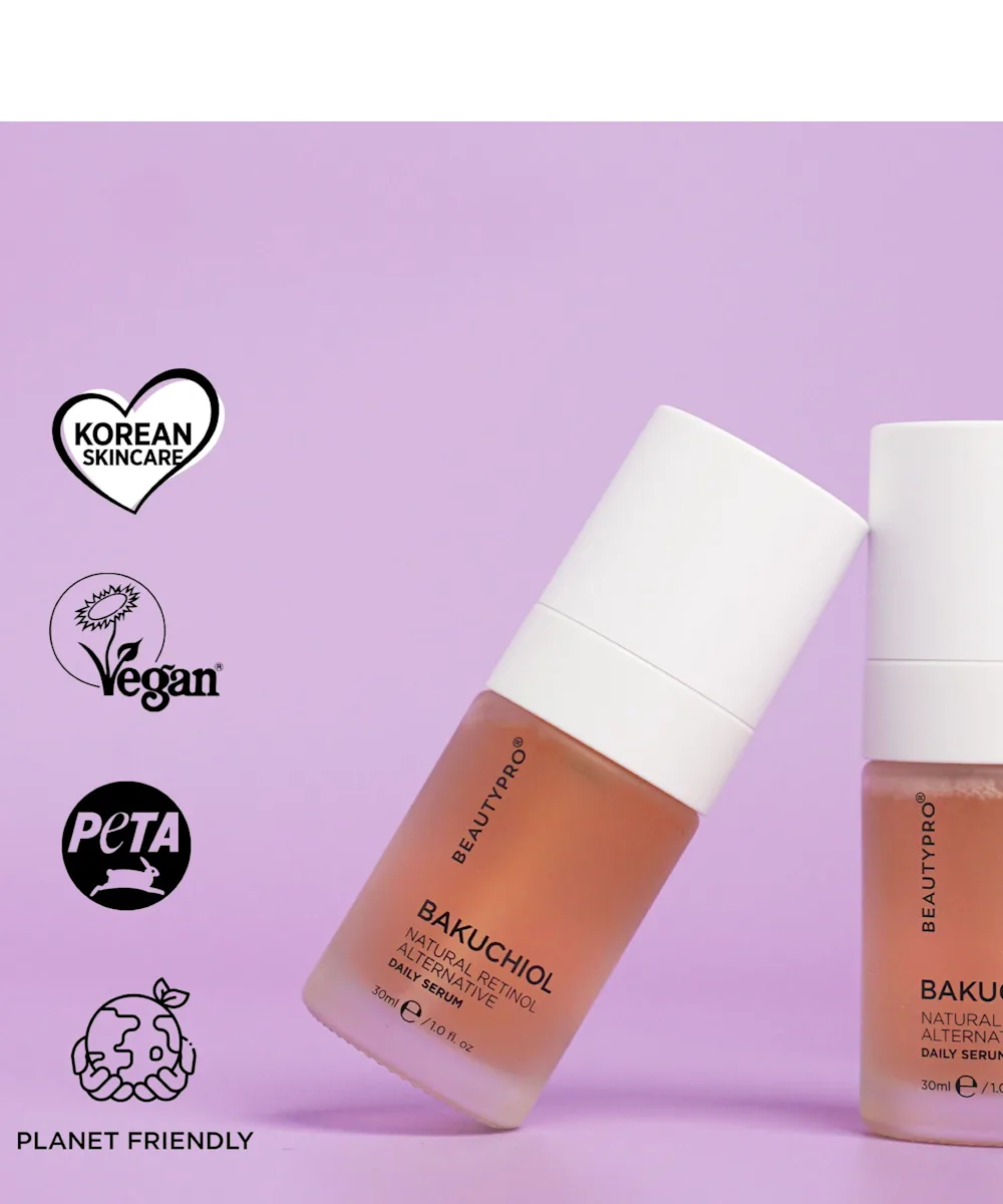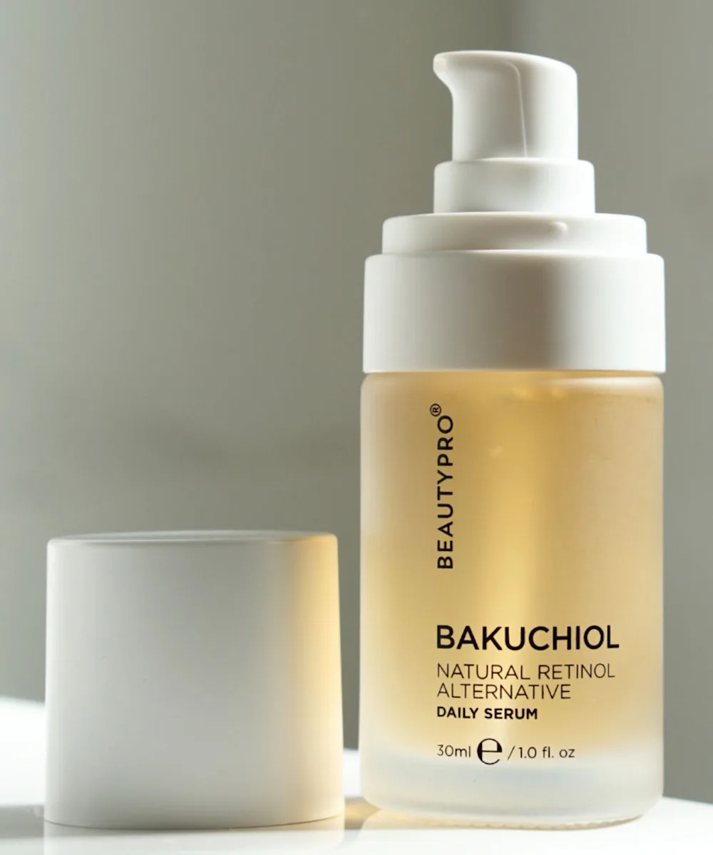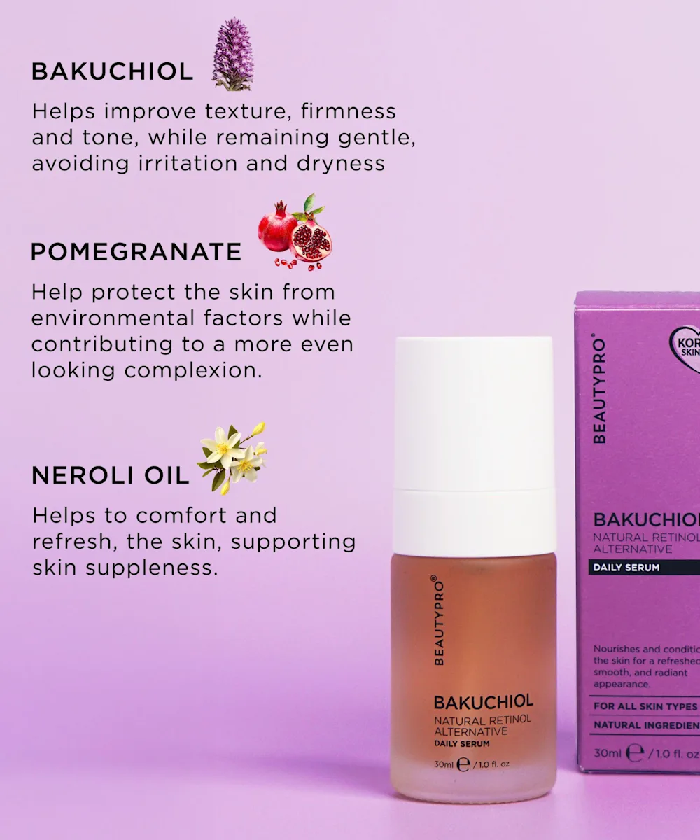 The BEAUTYPRO Bakuchiol Daily Serum is a plant-based serum formulated with bakuchiol and pomegranate to support the skin’s natural appearance and promote a radiant-looking complexion. Bakuchiol is a plant-derived ingredient often used as a less-drying and irritating alternative to retinol. Sourced from the Psoralea Corylifolia plant, bakuchiol contains antioxidant properties that help to protect the skin from external stressors while supporting a smoother, more refined look. Plus, pomegranate is known for its antioxidant properties, which help to defend the skin against environmental factors. It also has hydrating benefits that help to maintain the skin’s moisture balance, leaving it feeling soft and looking refreshed.
