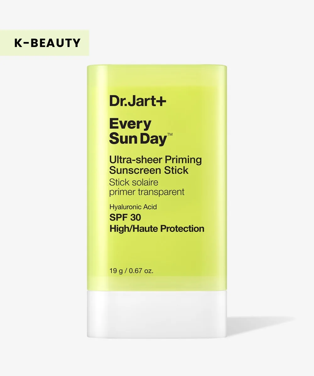 Protect your skin using the Dr. Jart+ Every Sun Day Primer Sunscreen Stick SPF 30. This innovative Korean SPF stick delivers a weightless, invisible matte finish while instantly blurring pores and priming the skin with no white cast. Infused with Hyaluronic Acid, it provides all-day hydration, improving skin texture and reducing oily shine. Its ultra-sheer, non-greasy formula, made possible by cutting-edge Korean innovation, ensures a smooth application without stickiness. Designed for effortless reapplication (even over makeup) this SPF 30 sunscreen protects against sun damage while keeping skin fresh and hydrated throughout the day. The portable stick format makes it perfect for touch-ups on the go, offering a seamless way to hydrate, prime, and protect your skin.