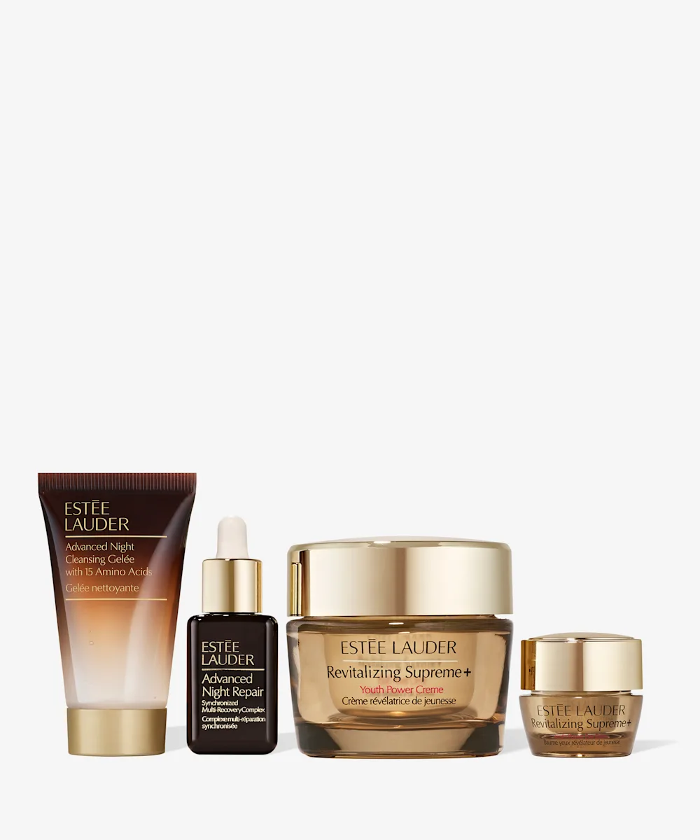 Elevate your glow with the Estee Lauder Supreme+ Skincare Set. These formulas significantly improve firmness, density, and elasticity for a more lifted look. It reduces the look of lines and wrinkles and leaves skin stronger, radiant, deeply hydrated; glowing with a new healthy-looking vitality. The Advanced Night Cleansing Gelée washes away makeup and impurities from skin’s surface, without stripping or disturbing the moisture barrier to help skin feel soft, comfortable, and balanced. The Revitalizing Supreme+ Eye Balm helps reduce the look of lines and dark circles with continued use, leaving the eye area looking radiant and more youthful. Over time, Advanced Night Repair Serum helps skin look smoother and less lined, younger, healthier—more radiant, and even toned. And the Revitalizing Supreme+ Creme Moisturizer significantly improves skin’s firmness, and elasticity for a firmer feel and more lifted look.