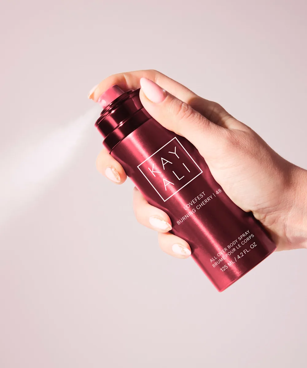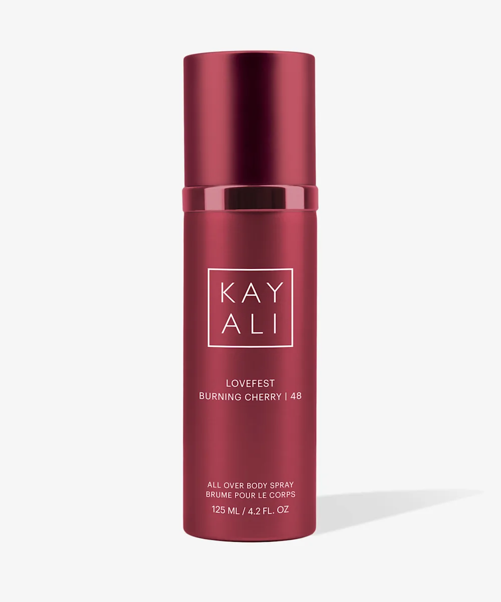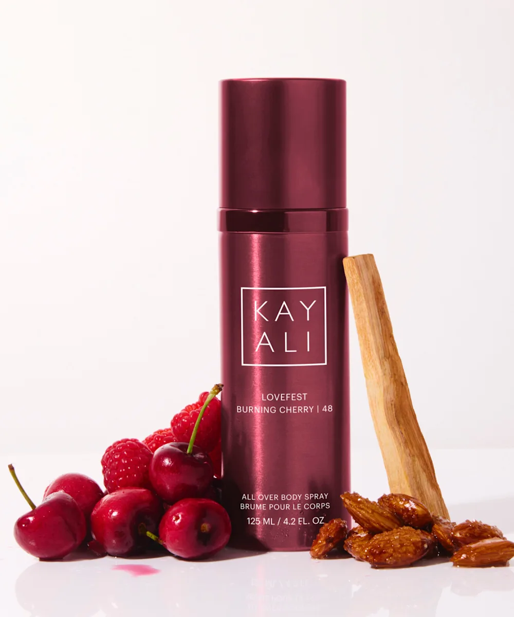 Sptritz on something delicious with the limited-edition KAYALI Lovefest Burning Cherry | 48 All Over Body Spray. It's a soft twist on the original sultry eau de parfum, wrapping you in a continuous, irresistible mist. Perfect for mornings, post-workouts, or evenings out, this versatile spray uplifts your senses anytime, anywhere. Celebrate your free spirit with this luscious, woody gourmand fragrance featuring burning cherry at its heart, juicy raspberry, and sparkling Italian bergamot. Floral notes of rose damascena, jasmine sambac, and heliotrope blend with sweet praline for a decadent touch, while smoky palo santo, guaiac wood, and ambery Peru balsam create a warm, sensual finish.